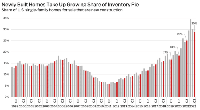 Twenty-nine percent of U.S. single-family homes for sale in the third quarter were new construction—up from 25% in the third quarter of 2021, the highest share of any third quarter on record, according to a new report from Redfin (redfin.com).