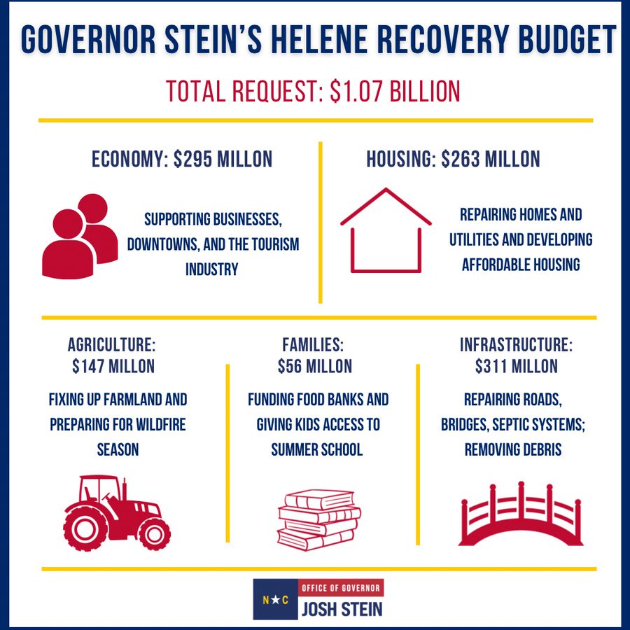 “The people of western North Carolina have suffered tremendously since Helene swept through,” Gov. Josh Stein said in a statement. “I appreciate what the General Assembly has done so far, but it’s time for us to step up and get them the money they need right now to rebuild. We can’t forget western North Carolina – and I will do everything in my power to ensure that the state shows up for them.”